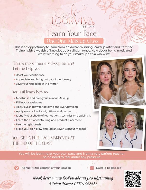 This is a 1-1 Makeup Class suitable for beginners and makeup enthusiasts and at the comfort of your location. It is for 3 hours, £60 per hour so, £180 in total.
